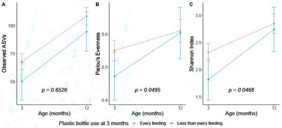 Infants who used plastic bottles less frequently at 3 months had lower alpha diversity metrics at 3 months of age compared to infants who used plastic bottles every feeding; however, this association was attenuated and non-significant after adjustment for infant diet (Supplementary Table S6). There were no significant associations between plastic bottle frequency at 3 months and microbiome alpha diversity at 12 months (Supplementary Table S6). Results were similar in subgroup sensitivity analyses (Supplementary Tables S7 and S8) and when comparing by feeding method among infants who used plastic bottles at every feeding (Supplementary Table S9). In linear mixed models, we report significant interactions for Pielou evenness and Shannon index such that infants fed plastic bottles at less than every feeding started with lower alpha diversity metrics at 3 months but increased to similar levels of alpha diversity metrics at 12 months when compared to infants fed with plastic bottles at every feeding (Figure 2).