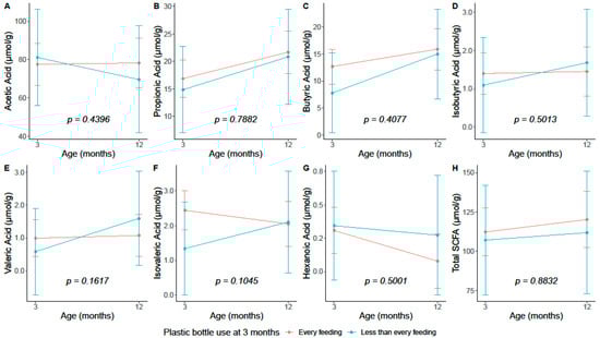Infants fed with a plastic bottle less than every feeding at 3 months had a significantly lower isovaleric acid concentration at 3 months of age; however, this association was attenuated and became non-significant after adjustment for infant diet (Table 3). Plastic bottle frequency at 3 months was not associated with any other SCFA nor with total SCFAs at either timepoint (Table 3). Results were consistent in sensitivity analyses (Supplementary Tables S11 and S12). Among infants with 3-month plastic bottle use at every feeding, having any breast milk vs. no breast milk at 3 months was associated with lower valeric acid at 3 months and with higher butyric acid at 12 months (Supplementary Table S13); however, we caution interpretation of the 12-month findings due to the small sample sizes. In linear mixed models, there were no significant interactions between 3-month plastic bottle frequency and time for any SCFAs (Figure 3).