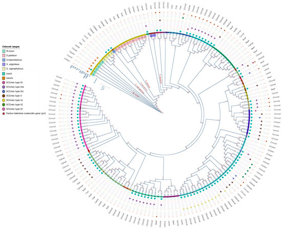 Staphylococcus phylogenetic tree, representing a core genome phylogeny based on single nucleotide polymorphisms (SNPs) derived from 160 Staphylococcus isolates, including 15 S. aureus clonal complexes (CC). The circles at the edge indicate the following (from inner to outer circles): 1. S. aureus isolate MLST sequence types indicated next to the isolate numbers; 2. The isolates numbers in the inner ranges of the circle are colored to represent different Staphylococcus species; 3. The colored shapes outside the circle indicate the presence of mecA and mecA1 genes, types of SCCmec, and the presence of the pvl gene; 4. S. aureus sources are indicated in the outer circle.