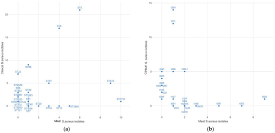 Scatter plots of S. aureus isolate sequence and spa types. (a) Sequence type distribution among patient- and meat-derived S. aureus isolates. (b) spa type distribution among patient- and meat-derived S. aureus isolates.