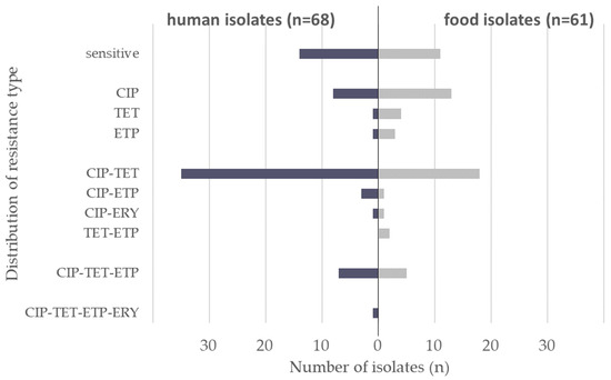 Resistance to gentamicin and chloramphenicol was not observed in German isolates. Food and human isolates were both predominantly resistant to ciprofloxacin (62.3 to 80.9%), followed by tetracycline (47.5 to 64.7%) and finally to ertapenem (17.6 to 18.0%). Resistance to erythromycin was observed always in combination with resistance to ciprofloxacin at a low level (1.6 to 2.9%) and only in C. coli isolates.