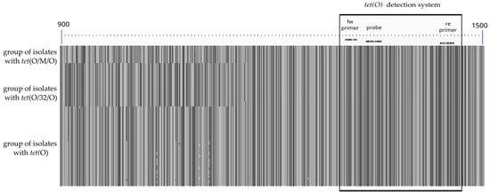 Detection system for tet(O) and tet(O) mosaic variants (Aliview 1.2.6.). From the top, 3 groups of isolates, with mosaic variant tet(O/M/O), with mosaic variant tet(O/32/O) and with gene tet(O). Figure 2 shows a segment of the alignment from nucleotides 900 to 1500. The detection system for tet(O) covers the nucleotides between 1304 and 1460. The complete sequence alignment extends over 1920 nucleotides.