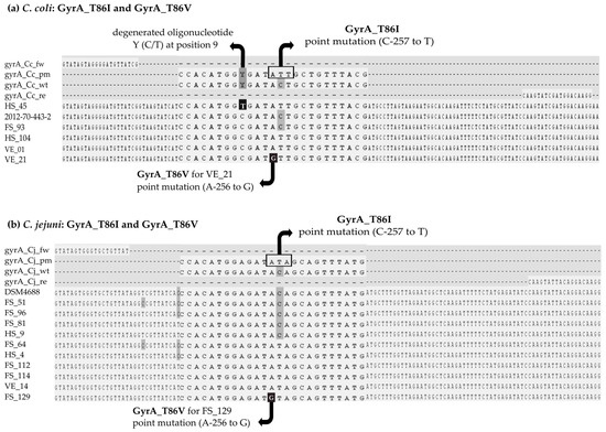 Primer binding sites for GyrA_T86I and GyrA_T86V of C. coli and C. jejuni (Aliview 1.2.6.); HS, human isolates; FS, food isolates; VE, Vietnamese food isolates; Cj, C. jejuni; Cc, C. coli.