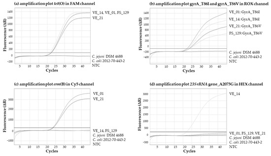Amplification plots of the pentaplex real-time PCR-assay using AriaMx are presented in Figure 4. The two sensitive control strains C. jejuni strain DSM 4688 and C. coli strain 2012-70-443-2 were negative for the four detection systems for resistance determinants (Figure 4a–d). The positive control strains VE_01 and VE_14 were positive for the resistance determinants tet(O) and GyrA_T86I (Figure 4a,b). In addition, Figure 4c and Figure 4d highlight the difference in the erythromycin resistance determinant, erm(B) gene for VE_01, and the point mutation 23S rRNA_A2075G for VE_14 respectively.