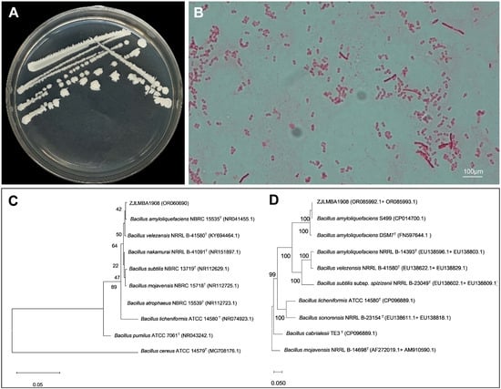 - Chun, J.; Bae, K.S. Phylogenetic analysis of Bacillus subtilis and related taxa based on partial gyrA gene sequences. Anton. Leeuw. Int. J. G. 2000, 78, 123–127. [Google Scholar] [CrossRef]
