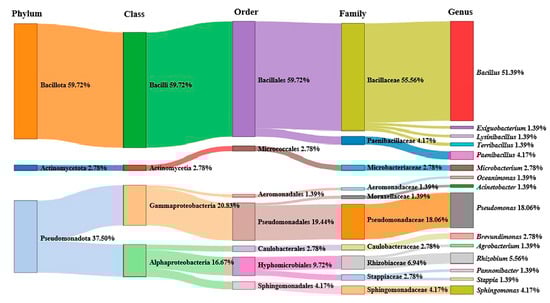 A total of 200 culturable bacterial 16S rRNA fragments were identified via PCR from 56 marine water samples from the South China Sea. After sequence analysis, 72 different bacterial strains belonging to 3 phyla, 4 classes, 7 orders, 10 families and 15 genera were obtained. Among them, Bacillus was the most abundant genus, accounting for up to 51.39% (Figure 1). The phylogenetic analysis results showed that 72 different bacteria belonged to four classes: Gammaproteobacteria, Alphaproteobacteria, Bacilli and Actinomycetia. Bacilli was the most dominant class (59.72%), followed by Gammaproteobacteria (20.83%) and Alphaproteobacteria (16.67%) (Figure 2).