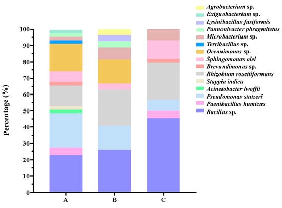 There was no significant difference between water depths. The average of 2–4 m, 6–8 m and 10–15 m was 2.47, 1.47 and 2.4 strains/sample, but the ANOVA result showed no significant difference between different water depths (p = 0.59). Multiple range tests also showed no significant differences between samples from different depths (all p > 0.5). Bacillus sp. was the most abundant species in all depths, especially at 10–15 m, accounting for up to 45.45% (Figure 3).