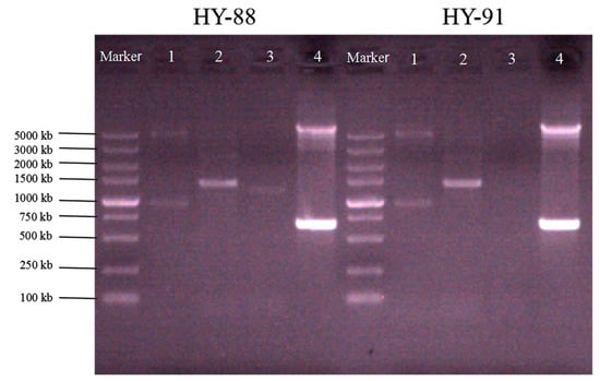 A total of 18 strains with fungistatic genes were screened through sequence alignment (Figure 4). Two strains, HY-88 and HY-91, were identified using PCR amplification. The functional gene detection could amplify the polyketide compound synthesis gene PKSI with a target fragment of 750 bp, and the band was bright. At the same time, the two strains detected that the fenB gene involved in the synthesis of lipopeptide antibiotics had a band of 1400 bp, and the BamC fragment size was 957 bp, which was weaker than that of the PKSI gene. HY-88 also detected a 1200 bp fragment of ituD, a gene involved in the synthesis of lipopeptide antibiotics, as shown in Figure 4. Subsequent fungal inhibition experiments mainly focused on the two strains HY-88 and HY-91 antagonists.