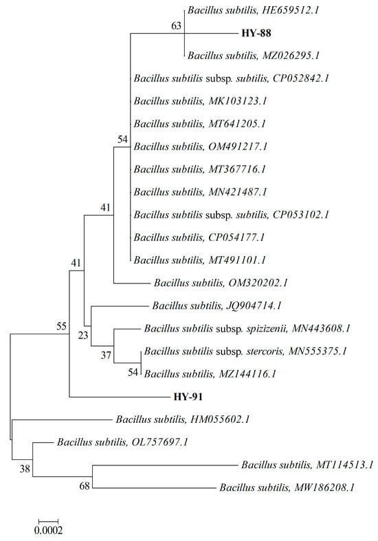 The BLAST tool analysis results indicated that both HY-88 (MZ895433) and HY-91 (MZ895436) belonged to the species Bacillus subtilis (Figure 5). HY-88 had the closest homology with Bacillus subtilis (HE659512.1) and Bacillus subtilis (MZ026295.1), with 99.72% sequence identity. HY-91 was closely related to Bacillus subtilis (OL757697.1), with 99.93% sequence identity. The strains HY88 (MZ895433) and HY-91 (MZ895436) were in different outgroups.