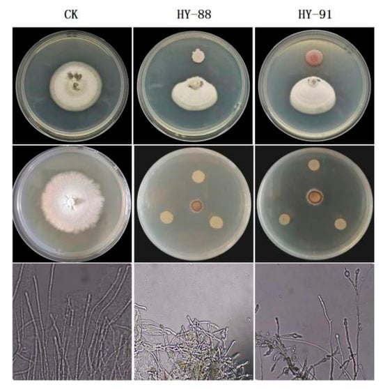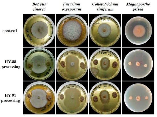 Plate confrontation showed that HY-88 and HY99 were antagonistic to different phytopathogens (Figure 6). HY-88 and HY99 were most antagonistic to Magnaporthe grisea with inhibition rates of 90.91% and 80.34%. The inhibition rates of HY-88 against Botrytis cinerea, Colletotrichum viniferum and Fusarium oxyporum were 51.72%, 54.29% and 52.17%, respectively. Similarly, HY-91 showed an inhibition effect on Botrytis cinerea, Colletotrichum viniferum and Fusarium oxyporum with 34.48%, 48.57% and 47.83% inhibition rates, respectively (Table 2).
