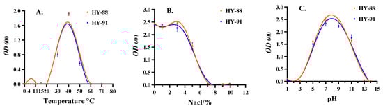 Both HY-88 and HY-91 could grow in the concentration range of 1–10% NaCl. However, with the increase in NaCl concentration, both strains grew slowly. HY-88 was more salt tolerant than HY-91, but no significant difference was detected. When the concentration of NaCl was 7–10%, HY-88 and HY-91 almost failed to grow (Figure 9B).
