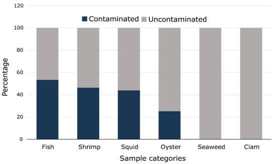 Bar graph showing the percentage of seafood samples contaminated in each sample category.