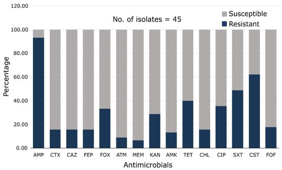Susceptibility to 15 antimicrobial agents (from 12 different classes) was investigated using the Kirby–Bauer disk diffusion assay method in compliance with the Clinical and Laboratory Standard Institute (CLSI, 2020) [18]. The antibiotic panel (Eiken Chemical Co., Ltd.) included ampicillin (10 µg), cefotaxime (30 µg), ceftazidime (30 µg), cefepime (30 µg), cefoxitin (30 µg), aztreonam (30 µg), meropenem (10 µg), amikacin (30 µg), kanamycin (30 µg), tetracycline (30 µg), chloramphenicol (30 µg), ciprofloxacin (5 µg), sulfamethoxazole-trimethoprim (23.75/1.25 µg), and fosfomycin (50 µg). Bacterial cultures (single colonies) from each isolate were suspended in sterile normal saline (0.85% NaCl, w/v) and the optical density was adjusted to 0.5 MacFarland standard. The resulting suspension was surface-spread on Muller–Hinton agar (Eiken Chemical Co., Ltd.) using a sterile cotton swab. Each antibiotic-treated disk was carefully placed on an inoculated agar plate. The plates were incubated at 37 °C for 16–18 h and the results were interpreted based on the interpretative chart supplied with the antimicrobial agent. The minimum inhibitory concentration (MIC) of colistin was determined using the broth microdilution method in cation-adjusted Mueller–Hinton broth (Becton, Dickson and Company, MD, USA), in accordance with the 2021 recommendations of the European Committee on Antimicrobial Susceptibility Testing (EUCAST, 2021) [19]. E. coli ATCC 25922 was used as the quality control strain. Isolates displaying intermediate resistance were considered resistant to antimicrobial agents. Multidrug resistance is defined as the resistance to three or more antimicrobial classes [20]. The multiple-antibiotic resistance (MAR) index of the isolates was established as previously described [21]. The MAR index is defined as the ratio of a and b, where “a” is the number of antibiotics to which an isolate was resistant and “b” is the number of antibiotics to which the same isolate was exposed. A MAR index higher than 0.2 means that the tested isolates originated from a high-risk contamination source where antibiotics are frequently used.