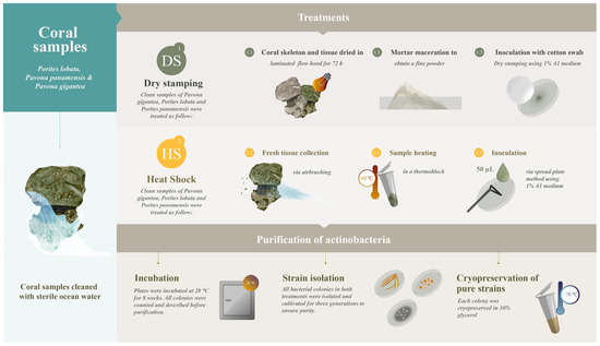 Coral samples of healthy adult colonies of Porites lobata (PL), Porites panamensis (PP), and Pavona gigantea (PG) were collected from several tropical coral ecosystems in the central Mexican Pacific (19°5′55.21″, 104°23′24.47″) by scuba diving during the 2018 winter season. Coral samples were immediately stored at 4 °C and transported to the laboratory. Once in the laboratory, the seawater and mucus secretions on the surface of the coral samples were removed. The coral samples were then repeatedly washed with sterile seawater. The clean samples were used to evaluate the effectiveness of two methods, dry stamping and heat shock, in isolating symbiont actinobacteria (Figure 1).