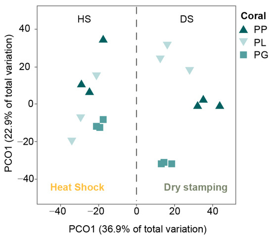 Principal coordinate analysis (PCoA) of the actinobacteria assemblages obtained from the three coral species: Porites lobata (PL), Porites panamensis (PP), and Pavona gigantea (PG). Treatments: DS (dry stamping) and HS (heat shock).