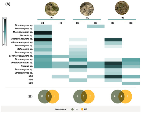 Shadeplot of the diversity and abundance of the taxonomically identified actinobacteria isolated from (A) Porites panamensis (PP), Porites lobata (PL), and Pavona gigantea (PG) in the (B) DS (dry stamping) and HS (heat shock) treatments.