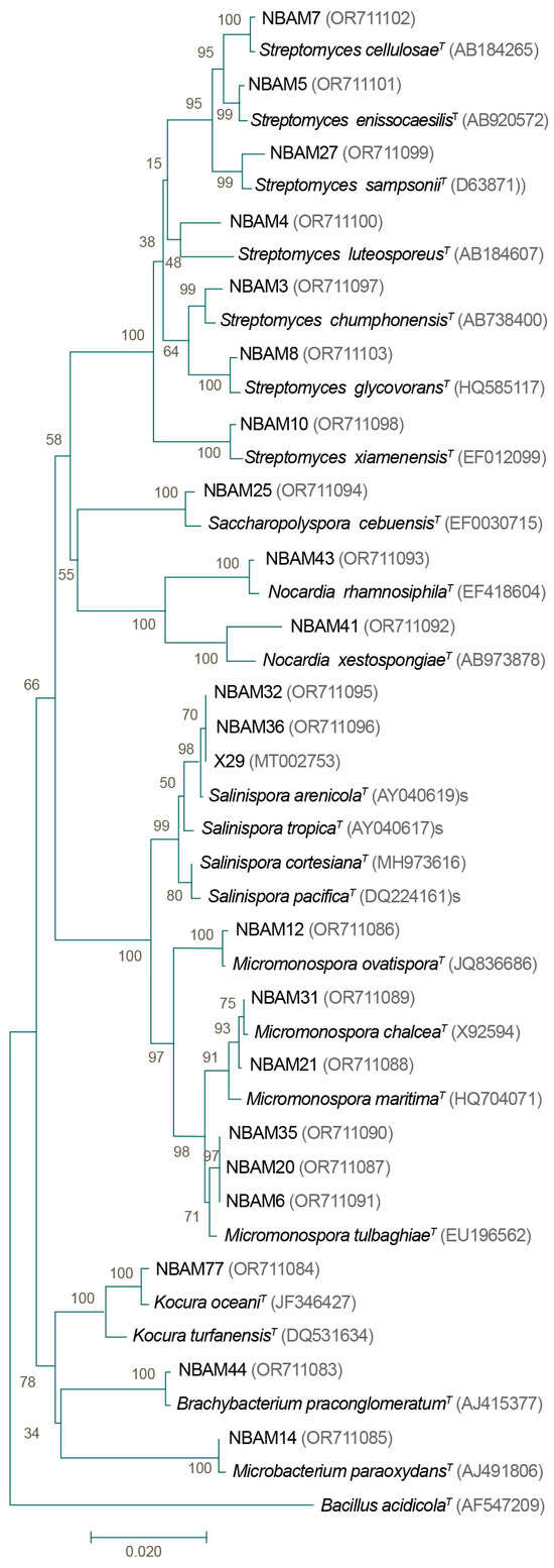 DNA was extracted from the isolated actinobacteria strains grown for eight days in liquid A1 medium at 28 °C with agitation (200 rpm). The commercial DNA isolation kit DNeasy ® Blood and Tissue Kit Cat. N° 69,506 (Qiagen, Germantown, MD, USA) was used following the protocol of the manufacturer with modifications from Gontang et al. [22]. 16S ribosomal amplification was conducted with extracted DNA using the primers FC27 (5′-AGAGTTTGATCCTGGCTCAG-3′) and RC1492 (5′-TACGGCTACCTTGTTACGACTT-3′) and Dream Taq Green Master Mix (2X) (#K1081, Thermo Fisher Scientific, Waltham, MA, USA) in a total volume of 50 µL. The PCR reaction had an initial denaturation step of 95 °C for 15 min, followed by 32 amplification cycles (95 °C for 1 min, 61 °C for 1 min, and 72 °C for 1 min) and a final extension step of 72 °C for 7 min [22]. The commercial kit Wizard® SV Gel and PCR Clean-Up System (Promega, Madison, WI, USA) was used to purify the PCR Products. The 16S ribosomal products were then sequenced at the DNA Synthesis and Sequencing Unit of the Institute of Biotechnology (National Autonomous University of Mexico, Cuernavaca, Mexico). 16S ribosomal sequences were assembled to a total of 1200–1400 bp and deposited in GenBank under the accession numbers OR711083–OR711103. The phylogenetic tree was constructed using the Neighbor-Joining method. Briefly, we employed 1300 base pairs, a bootstrap test (1000 replicates), the p-distance method, and the actinobacteria sequences of the closest type strains and Bacillus acidicola as outgroups. The sequences were multiple-aligned using ClustalX [29]. All analyses were conducted in MEGA7 [30].