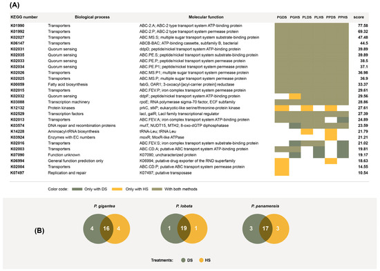 (A) Piphillin scores of the top 20 most overrepresented functions for all species and treatments. The scores are averages across all three species (Porites lobata (PL), Porites panamensis (PP), and Pavona gigantea (PG)) and treatments (DS (dry stamping) and HS (heat shock)). The list includes 26 elements, as there was no perfect overlap of the top 20 functions for all samples. (B) Overlap among the top 20 most overrepresented functions found in bacterial colonies isolated via dry stamping and heat shock in three different coral species.