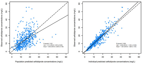 Diagnostic scatter plots of population pharmacokinetic model. (Left panel): observed versus. population-predicted concentrations. (Right panel): observed versus individual-predicted concentrations.