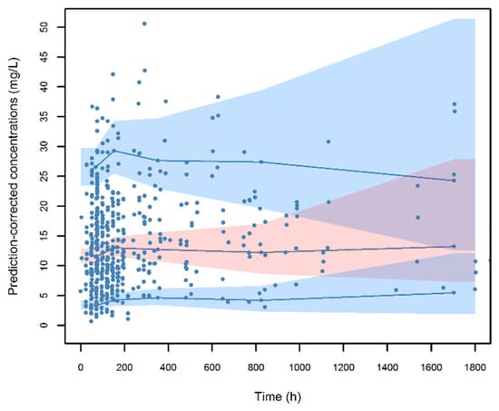 Model evaluations were based on the evaluation of standard goodness of fit plots. These were the observed vs. population- and individual-predicted concentrations, the distribution of the weighted residuals vs. time and vs. predicted concentrations, and the visual predictive check (VPC) plot. The VPC plot compares graphically the empirical percentiles (summarized by the 10th, 50th, and 90th percentiles of the observed data) with the theoretical percentiles computed using multiple Monte Carlo simulations (summarized by colored areas). Model performance was also tested by assessing the distribution of the normalized prediction distribution errors (NPDE). The 95% confidence interval of each parameter in the final model was simulated from 1000 nonparametric bootstraps based on resampling by means of the Rsmlx (R speaks Monolix) package of R (Version 2023.1.5).