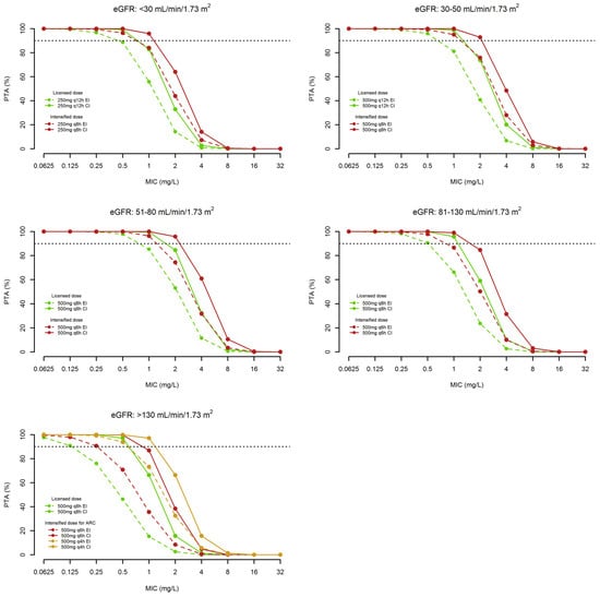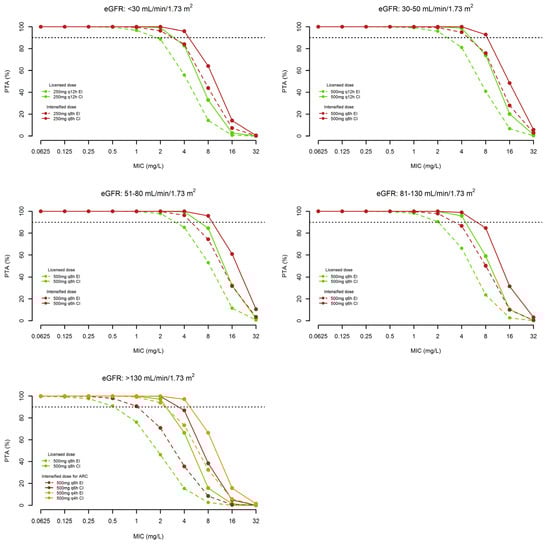 A paradigm shift in the concept of desired PK/PD target attainment with beta-lactam is currently occurring nowadays [] from the traditional 50–100% t > MIC up to the aggressive PK/PD target of 100% t > 4–8 × MIC, which was considered optimal since it was recently shown to minimize the risks of microbiological failure and of resistance development [,,,]. Unfortunately, attainment of this aggressive target is never checked during drug development as it is not a requirement of the regulatory authorities. In regard to ceftobiprole, Muller et al. assessed the PTA of 100% T > MIC among patients treated for SSTI or nosocomial pneumonia, and Monte Carlo simulation showed that values >90% were achievable only against pathogens with an MIC up to 1 mg/L, although no data about simulated dosing regimens and tested classes of eGFR were reported [].