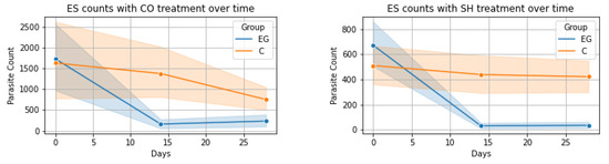 ES-CO Treatment: The Friedman test applied to the control group for ES parasite levels under CO treatment showed no significant variations over time (χ2(2) = 2.65, p = 0.265). However, the experimental group exhibited a notable change (χ2(2) = 24.61, p < 0.001). Wilcoxon signed-rank test comparisons in the control group revealed a significant decrease only between Day 14 and Day 28 (W = 202.5, p = 0.040), with no significant changes in other comparisons. In contrast, the experimental group saw significant decreases from Day 0 to Day 14 and Day 0 to Day 28 (W = 47.5 and W = 53.5, both p < 0.001), but not between Day 14 and Day 28. The Mann–Whitney U test indicated significant differences between the groups on Day 14 and Day 28 (U = 734.5 and U = 796.5 respectively, both p < 0.05).