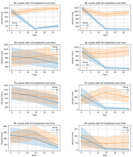 The evolution of the numbers of oocysts, cysts, and eggs per gram of fecal matter was visualized for each analyzed time point (Figure 1) containing the 95% confidence intervals. In the case of ES and BC, both treatments (CO and SH) had very distinct evolution on days 14 and 28. This is also true for the AS and TS in the treatment with SH but when treated with CO, the confidence intervals had a wide overlap indicating less distinct results. In the case of OE, both treatments seemed to have less of an effect.