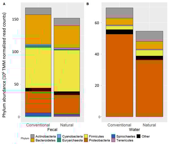 The abundance of phyla (>1%) in fecal (A) and catch basin water (B) samples normalized with the TMM (trimmed mean of m-values) method across conventional and natural feedlots.