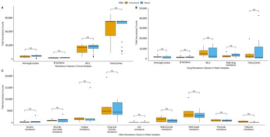 Boxplots of trimmed mean of m-value (TMM)-normalized gene abundance of resistance for abundant resistance classes (>25,000 normalized counts) in fecal samples (A); antimicrobial drug resistance classes in catch basin water samples (B); and biocide and metal resistance classes in catch basin water samples (C) (MLS = macrolide, lincosamide, streptogramin; analysis of the composition of microbiomes with bias correction and adjusted p-value significance used the Benjamini–Hochberg method; q > 0.05 = ns).