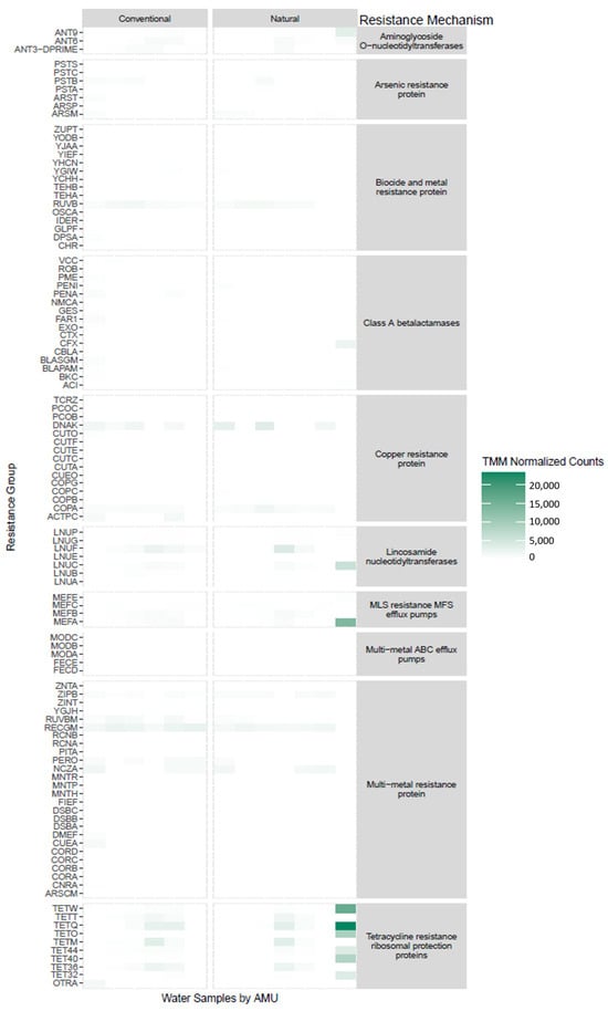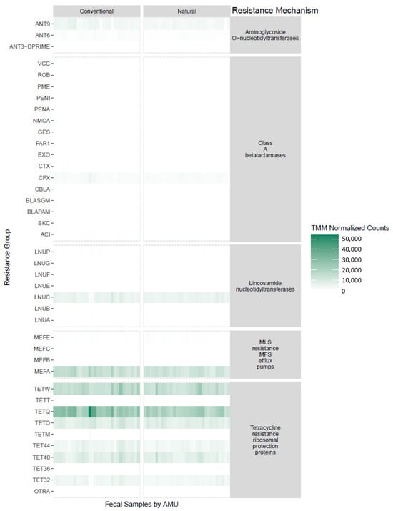 The resistance groups from the most abundant classes were visualized as heatmaps with groupings according to the resistance mechanism for feces (Figure 5) and catch basin water (Figure 6). For both the CONV and NAT fecal samples, ARGs conferring resistance to tetracyclines were most abundant, with tetW, tetQ, tetO, tet44, tet40, and tet32 predominating. Aminoglycoside O-nucleotidyltransferases were the next most abundant ARGs, with ant(9) and ant(5) being the most common. There were a number of ARGs that were lower in NAT than in CONV feedlots that had an abundance of >10,000 TMM-normalized counts, including mefA (q < 0.001), tet40 (q < 0.001), tetO (q < 0.05), tetQ (q < 0.0001), and tetW (q < 0.05).