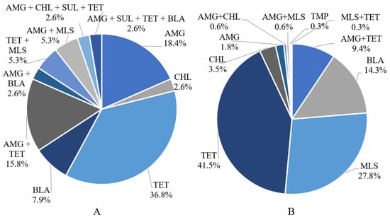 Fecal resistance profiles of ARG-carrying contigs from (A) 102 plasmids (n = 24 samples) and (B) 342 chromosomes (n = 60 samples). AMG = aminoglycoside; BLA = β-lactam; CHL = chloramphenicol; MLS = macrolide, lincosamide, and streptogramin; SUL = sulfonamide; TET = tetracycline; TMP = trimethoprim. With regard to chromosomal ARGs, the most abundant resistance class was tetracycline (41.5%) followed by MLS (28.7%), β-lactam (14.3%), chloramphenicol (3.5%), aminoglycoside (1.8%), and trimethoprim (0.3%; (A)). In most cases, no two ARGs belonging to the same class were associated with a contig, with the exception of two instances of two aminoglycoside ARGs, ant(6)-Ia and aph(3’)-III, and one instance of two tetracycline ARGs, tet(40) and tet(O).