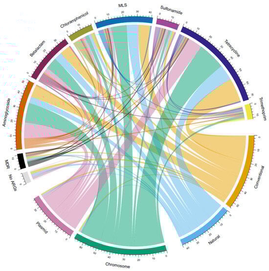 Chord diagram of associations between antimicrobial resistant gene classes in conventional vs. natural feedlots, and association with chromosomes or plasmids. Associations within the same antimicrobial resistance gene (ARG) reflect that there are multiple ARGs on the same contig that confer resistance to a single antimicrobial class. (MDR = multi-drug resistance from a single antimicrobial resistance gene).