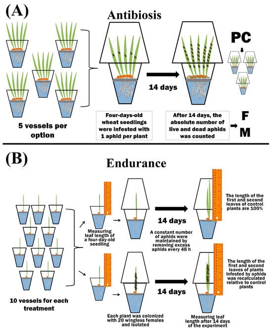 The scheme of bioassay of the different types of resistance to aphids—antibiosis (A) and endurance (B).