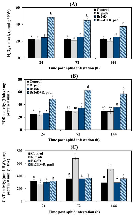 Influence of B. subtilis 26D strain (Bs26D) on the hydrogen peroxide (H2O2) content (A), peroxidase activity (POD) (B), and catalase activity (CAT) (C) of wheat plants infested with bird cherry-oat aphid R. padi. The samples are indicated as follows: Control—non-bacterized plants and unpopulated with aphids; Bs26D—plants treated with the B. subtilis 26D strain before sowing; R. padi—plants populated with aphids; Bs26D + R. padi—bacterized plants and populated with aphids. Figures present means ± SE (n = 6). Columns of each histogram marked with different letters represent the mean values that are statistically different from each other according to Duncan’s test (p ≤ 0.05).