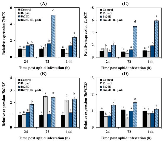 Influence of B. subtilis 26D strain (Bs26D) on the relative expression of genes involved in the SA biosynthesis, TaICS (A), the JA biosynthesis, TaLOX (B), the ethylene biosynthesis, TaACS (C) and the ABA biosynthesis, TaNCED (D) in wheat plants infested with bird cherry-oat aphid R. padi. The samples are indicated as follows: Control—non-bacterized plants and unpopulated with aphids; Bs26D—plants treated with the B. subtilis 26D strain before sowing; R. padi—plants populated with aphids; Bs26D + R. padi—bacterized plants and populated with aphids. Figures present means ± SE (n = 6). Columns of each histogram marked with different letters represent the mean values that are statistically different from each other according to Duncan’s test (p ≤ 0.05).