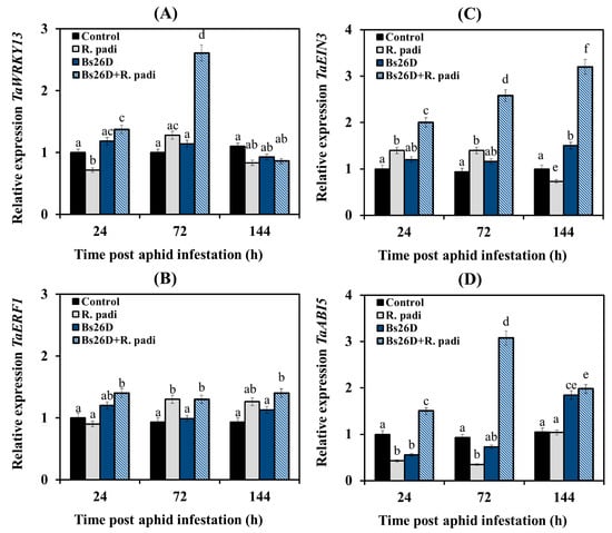 Influence of the B. subtilis 26D strain (Bs26D) on the relative expression of genes the SA signaling pathway, TaWRKY13 (A), the JA signaling pathway, TaERF1 (B), the ethylene signaling pathway, TaEIN3 (C) and the ABA signaling pathway, TaABI5 (D) in wheat plants infested with bird cherry-oat aphid R. padi. The samples are indicated as follows: Control—non-bacterized plants and unpopulated with aphids; Bs26D—plants treated with the B. subtilis 26D strain before sowing; R. padi—plants populated with aphids; Bs26D + R. padi—bacterized plants and populated with aphids. Figures present means ± SE (n = 6). Columns of each histogram marked with different letters represent the mean values that are statistically different from each other according to Duncan’s test (p ≤ 0.05).
