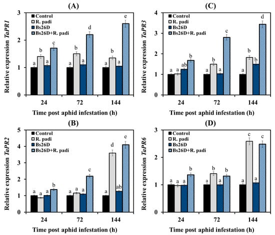 Influence of the B. subtilis 26D strain (Bs26D) on the relative expression of SA-dependent genes TaPR1 (A) and TaPR2 (B), ethylene-dependent gene TaPR3 (C), and JA-dependent gene TaPR6 (D) in wheat plants infested with bird cherry-oat aphid R. padi. The samples are indicated as follows: Control—non-bacterized plants and unpopulated with aphids; Bs26D—plants treated with the B. subtilis 26D strain before sowing; R. padi—plants populated with aphids; Bs26D + R. padi—bacterized plants and populated with aphids. Figures present means ± SE (n = 6). Columns of each histogram marked with different letters represent the mean values that are statistically different from each other according to Duncan’s test (p ≤ 0.05).