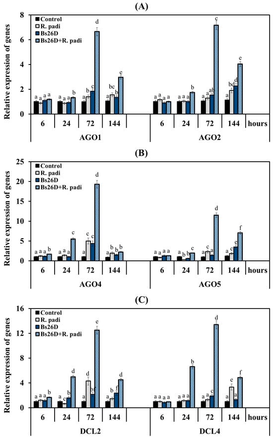 Influence of the B. subtilis 26D strain (Bs26D) on the relative expression of genes encoding RNAi enzymes AGO1 and AGO2 (A), AGO4 and AGO5 (B), DCL2 and DCL4 (C) in wheat plants infested with bird cherry-oat aphid R. padi. The samples are indicated as follows: Control—non-bacterized plants and unpopulated with aphids; Bs26D—plants treated with the B. subtilis 26D strain before sowing; R. padi—plants populated with aphids; Bs26D + R. padi—bacterized plants and populated with aphids. Figures present means ± SE (n = 6). Columns of each histogram marked with different letters represent the mean values that are statistically different from each other according to Duncan’s test (p ≤ 0.05).