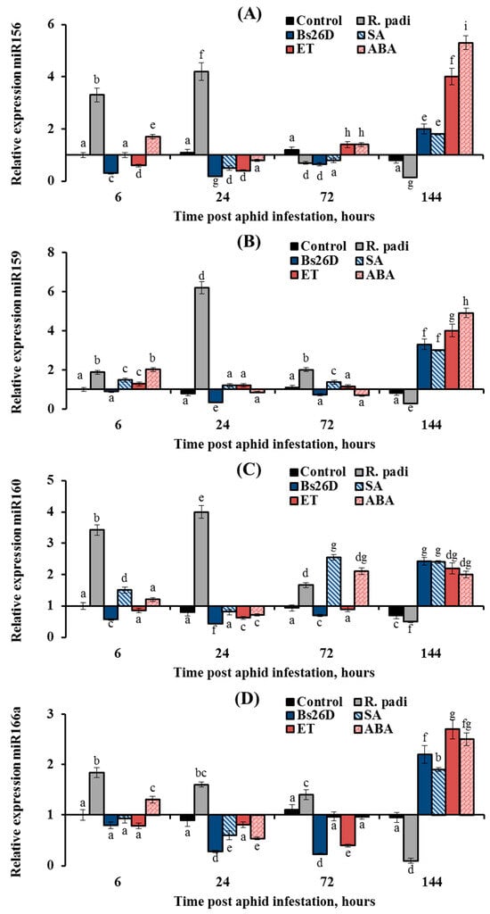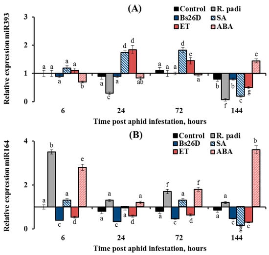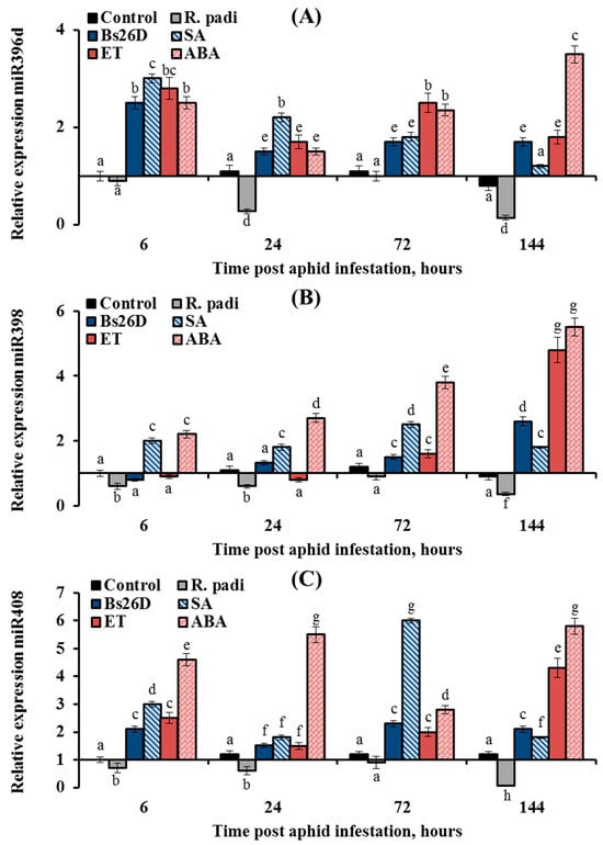 In this work, the expression of nine conserved microRNAs (miR156, miR159, miR160, miR164, miR166a, miR393, miR396d, miR398, and miR408) was studied in plants treated with the B. subtilis 26D strain and various phytohormones (ABA, SA, and ethylene) during the colonization of plants bird cherry-oat aphid R. padi (Figure 8, Figure 9 and Figure 10). Colonization of plants by bird cherry-oat aphids induced the expression of five miRNAs, miR164 (Figure 8B) and miR156, miR159, miR160, and miR166a (Figure 9); the greatest increase in the expression of these miRNAs was found after 6 and 24 h feeding of aphids on plants (Figure 8 and Figure 9). Additionally, colonization of plants by bird cherry-oat aphids inhibited the expression of four miRNAs, miR393 (Figure 8A), miR396d, miR398, and miR408 (Figure 10), throughout the experiment.
