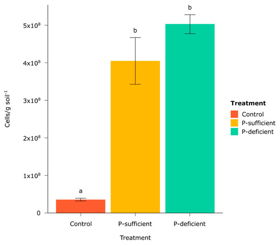 Microbial cell counts from chemotaxis assays in all P-sufficient and P-deficient exudate replicates were significantly higher than in the control treatment (Figure 1). No significant difference was observed in cell counts between exudate-baited treatments (Figure 1).