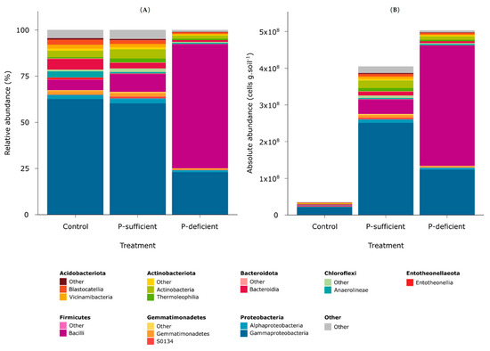 (A) Relative and (B) absolute (cell count-corrected relatives) abundances of bacterial communities captured in control, P-sufficient, and P-deficient treatments at the phylum and class levels.