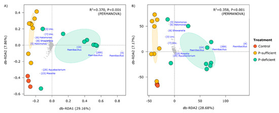 Distance-based redundancy analyses (db-RDA) summarising the compositional similarity of bacterial communities in control and exudate-baited traps as represented by Hellinger-transformed (A) relative, and (B) absolute abundances. In the top right of each panel are the results of PERMANOVA models in which treatment was a categorical predictor variable. Dominant operational taxonomic units (OTUs) identified at the genus level are shown in blue text with the OTU IDs in square brackets. These IDs are consistent between figures.