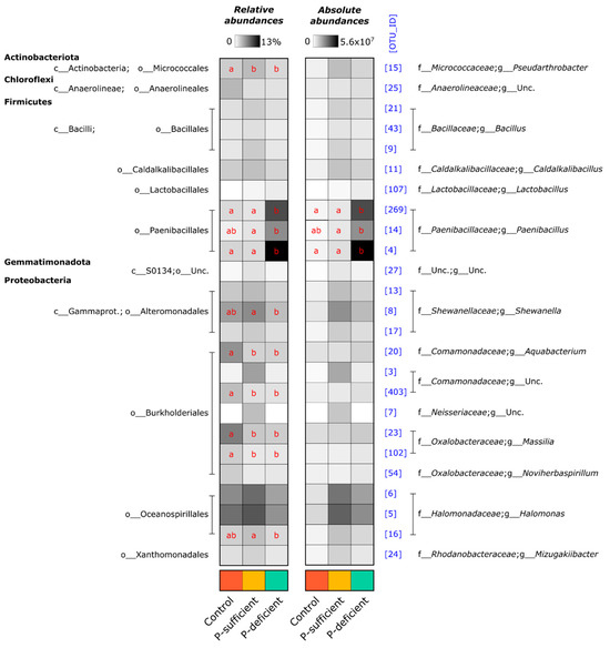 Heatmap summarising the relative and absolute-estimated abundances of bacterial OTUs present at ≥2% mean relative abundance in any treatment. Numbers in square brackets represent OTU IDs and are consistent with other figures. Red letters indicate the results of Tukey’s HSD post hoc tests for individual OTUs. Within OTUs, treatments sharing the same letter are not significantly different. Rows with no letters all shared the same letter.