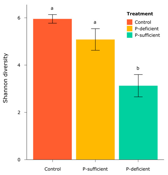 The alpha diversity of bacterial communities, as represented by Shannon’s Diversity Index, differed significantly between treatments (F = 7.76, p = 0.04, ANOVA), with P-deficient exudates attracting a significantly less diverse bacterial community than the control and P-sufficient treatments (Figure 5).