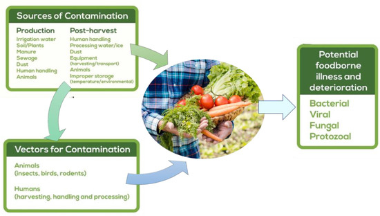Sources of contamination in vegetables crops during production and post-harvest; source: adapted from [87].