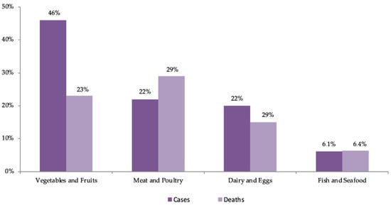 Distribution (%) of estimated cases of foodborne illness and deaths by food category in the USA in the period 1998–2008; source: [48,115].