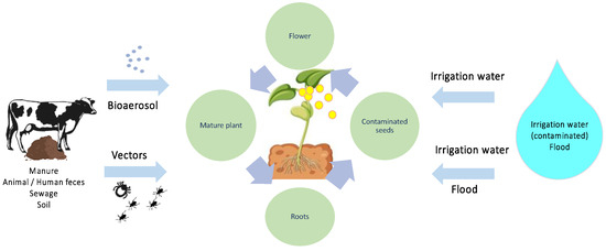 Figure 4 aims to demonstrate the entry points of pathogenic microorganisms and their persistence in the life cycle. Consequently, the contact between disinfectants and microorganisms can be challenging, as they may be internalized in the product, present on irregular surfaces, or in biofilms. Similarly, injuries caused by harvesting and transport can provide protected spaces where microorganisms can survive and grow, making disinfection difficult [138,139].