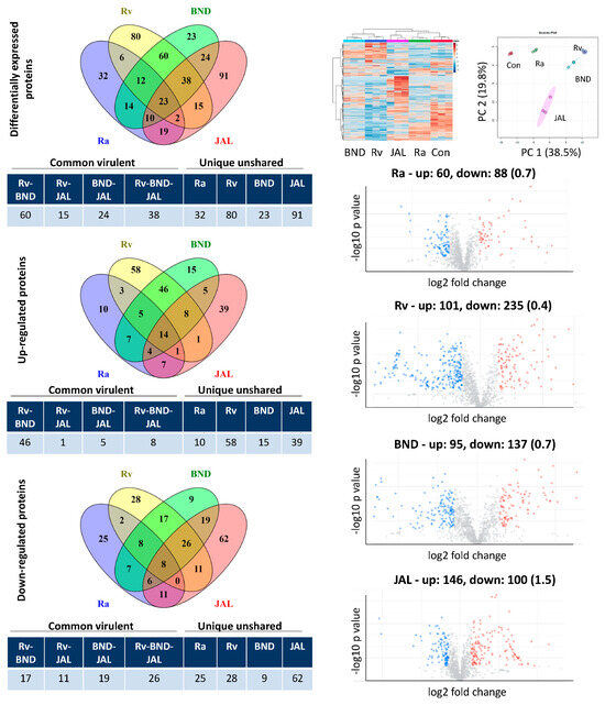 Label-free DIA-SWATH analysis of macrophage-like cell proteome after infection with different strains of M. tuberculosis at 18 h of infection. Host cells were harvested and subjected to LC-MS/MS analysis following protein extraction and trypsin digestion. Left panel: The number of differentially expressed proteins detected in each dataset. The differentially expressed proteins were grouped into common virulent proteins, if they were shared between any of the three virulent strains (H37Rv, BND433, and JAL2287), and unique unshared proteins, if they were not shared among them. Right panel: Unsupervised hierarchical clustering and principal component analysis of the protein profiling of THP1 cells. Volcano plots with up- and down-regulated proteins (up/down ratio in parentheses) for each dataset are also shown. Con: control; Ra: H37Ra; Rv: H37Rv; BND: BND433; JAL: JAL2287.