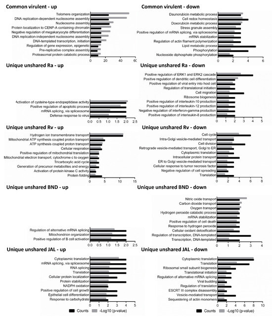 Biological processes were predicted for the differentially expressed proteins of macrophage-like cells after infection with different strains of M. tuberculosis at 18 h of infection. The differentially expressed proteins were grouped into common virulent proteins, if they were shared between any of the three virulent strain infections (H37Rv, BND433, and JAL2287), and unique unshared proteins, if they were not shared among them. Left panel: up-regulated proteins; right panel: down-regulated proteins. Ra: H37Ra; Rv: H37Rv; BND: BND433; JAL: JAL2287.