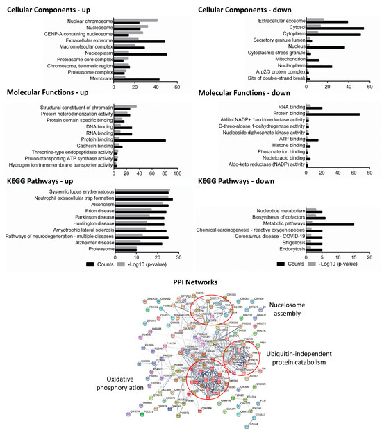 Cellular components, molecular functions, and KEGG pathways were predicted for the common differentially expressed proteins of the host that were shared between any of the three virulent strains (H37Rv, BND433, and JAL2287) after infection at 18 h of incubation. Upper left panel: up-regulated proteins; upper right panel: down-regulated proteins. Lower panel: protein–protein interaction (PPI) networks of protein interactions with Markov clustering in circles were also constructed. Nodes in the diagram represent proteins, and edges represent protein–protein interactions between the nodes. PPI: protein–protein interaction.